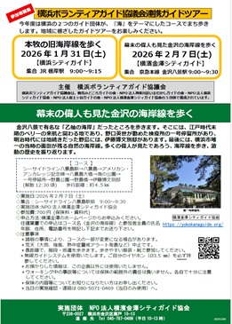 企260207H | 横浜ボランティアガイド協議会連携ガイド 「幕末の偉人も見た金沢の海岸線を歩く」 なお、1月31日(土)実施の「本牧の旧海岸線を歩く」コースの詳細については、実施団体であるNPO法人横浜シテイガイド協会のホームページをご覧ください。 www.ycga.com |