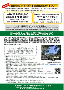 企260207H | 横浜ボランティアガイド協議会連携ガイド 「幕末の偉人も見た金沢の海岸線を歩く」 集合場所はシーサイドライン八景島駅です なお、1月31日(土)実施の「本牧の旧海岸線を歩く」コースの詳細については、実施団体であるNPO法人横浜シテイガイド協会のホームページをご覧ください。 www.ycga.com |