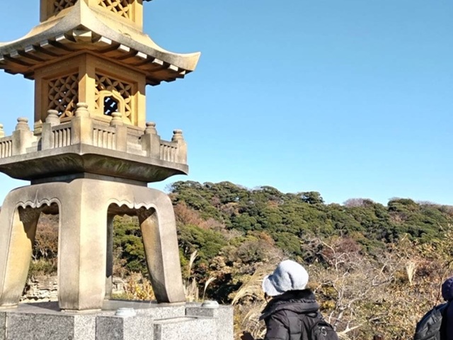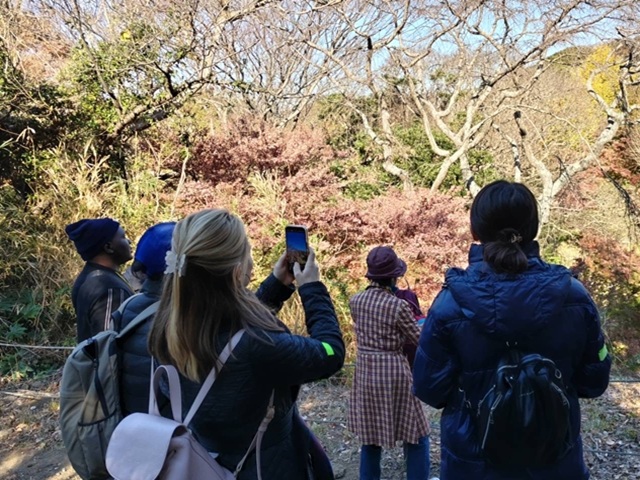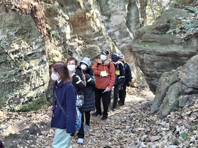 快晴で暖かく行楽日和の中、イチョウの葉はかなり落葉し楓も少し茶色くっていたとはいえ年に2回公開のまんだら堂を楽しまれた様子でした。今回の街歩きは海外の方と一緒で途中に国際交流のため展望広場で海外からの参加者の自己紹介と質問コーナーの中でにこやかに英語と日本語交じりで自己紹介して下さり、日本人からは各種の質問が飛び交い楽しいひと時を持つことが出来ました。ウクライナ出身の安青錦の事、カザフスタンでも空手や相撲など日本由来のスポーツが盛んなことやウガンダの大きな湖ビクトリア湖は美しいけれど危険な魚がいて泳ぐことが出来ないなどの話題で盛り上がった街歩きでした。
