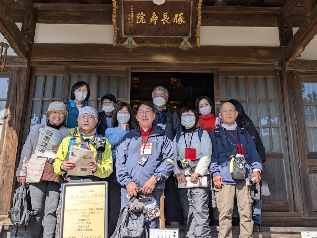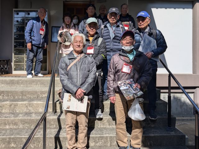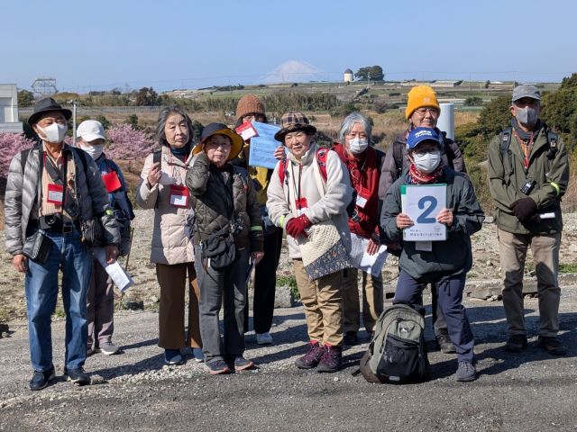 谷津庚申塔群を横目に六国峠を越え頂上の能見堂跡地では江戸時代に多くの人たちも見たかもしれない梅林を鑑賞。富士山は恥ずかしげに霞の中にそびえたっていました。宮川せせらぎ緑道をすぎ金沢自然公園にてお客様の許可をいただき班ごとの集合写真をパチリ。皆様の笑顔は、梅にも負けず満開!菜の花と梅の競演を満喫いただけました。
