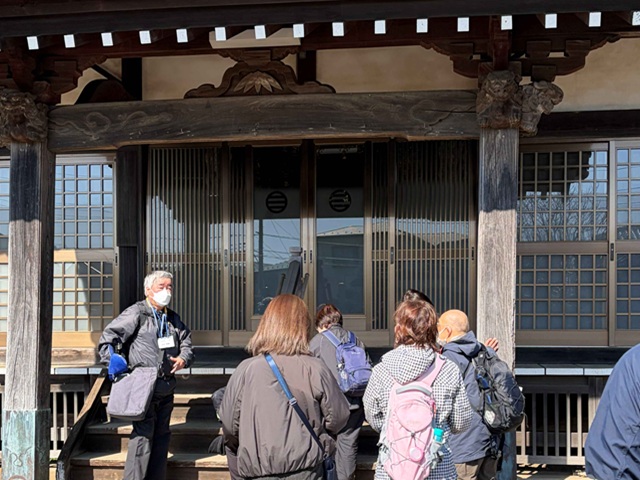 寒波が来ているとのことで少し寒かったですが、まずまずの天候でした。今回のコースは当協会の定番コースで前回は2年前に行いました。今回も谷津関ヶ谷不動尊と赤井不動尊・正法院の二か所をお参りしました。ゴールの正法院ではガイド参加者全員でご住職のお話を伺い護摩焚きをしていただきました。